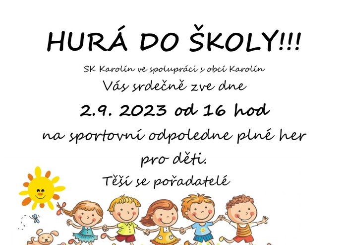 SK Karolín ve spolupráci s obcí Karolín Vás srdečně zvou, dne 2.9. 2023 od 16 hod, na sportovní odpoledne plné her pro děti. Těší se pořadatelé