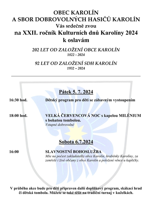 Dovolujeme si Vás pozvat, na tradiční oslavy obce Karolín a SDH Karolín, s následujícím programem. V pátek 5.7.2024 od 16:30 minut je připraven dětský program, od 18:00 bude k tanci a poslechu hrát skupina Milénium. V průběhu dne budou připraveny doplňkové programy, jako je dětská tombola, skákací hrad, tombola a turnaj v kuželkách. V sobotu 6.7.2024 nás poté od 16:00 čeká tradiční slavnostní bohoslužba před kapličkou. Tímto všechny co nejsrdečněji zveme.