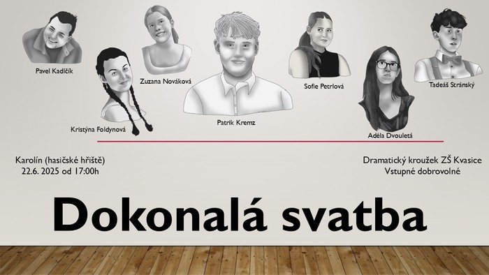Dramatický kroužek ZŠ Kvasice a obec Karolín si Vás dovolují pozvat na divadelní představení žáků ZŠ Kvasice ... DOKONALÁ SVATBA. A to v neděli 22.6.2025 od 17:00 na kulturně sportovním areále na Karolíně. Vstupné je dobrovolné a můžete se těšit na bohaté občerstvení.