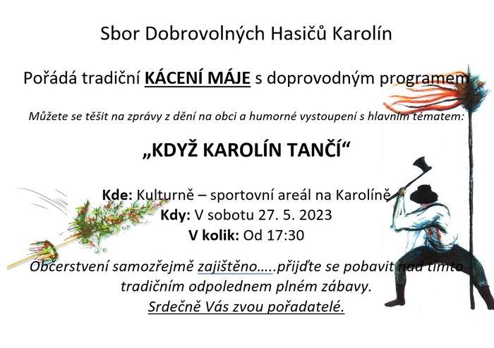 Sbor dobrovolných hasičů Karolín pořádá tradiční KÁCENÍ MÁJE s bohatým doprovodným programem. Můžete se těšit na zprávy z dění na obci a humorné vystoupení s podtitulem "Když Karolín tančí". Akce se uskuteční na kulturně-sportovním areále a to v sobotu 27.5.2023 od 17:30 hodin. Občerstvení samozřejmě zajištěno! Přijďte se pobavit nad tímto tradičním odpolednem plném zábavy. Srdečně Vás zvou pořadatelé.
