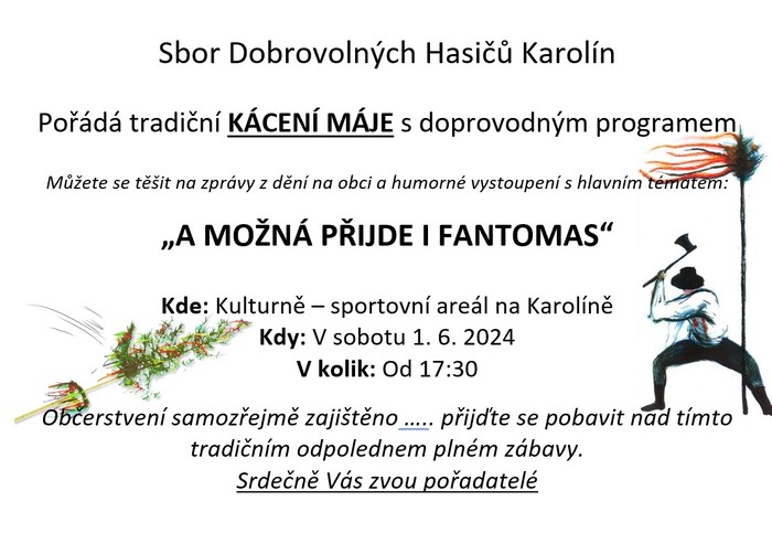 Sbor Dobrovolných Hasičů Karolín, pořádá tradiční KÁCENÍ MÁJE s doprovodným programem. Můžete se těšit na zprávy z dění na obci a humorné vystoupení s hlavním tématem: „A MOŽNÁ PŘIJDE I FANTOMAS“. A to již tradičně na kulturně – sportovní areál na Karolíně, v sobotu 1. 6. 2024 od 17:30 hodin. Občerstvení samozřejmě zajištěno ….. přijďte se pobavit nad tímto tradičním odpolednem plném zábavy. Srdečně Vás zvou pořadatelé.