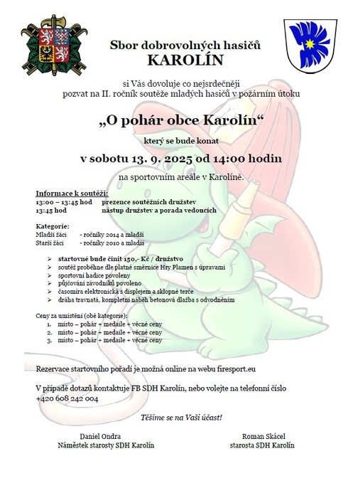 Sbor dobrovolných hasičů Karolín zve všechny příznivce požárního sportu na závody mladých hasičů v požárním útoku. A to v sobotu 13.9.2025 od 14 hodin na kulturně-sportovním areále na Karolíně. K vidění budou krásné požární útoky mladých hasičů a hlavně se na dráze představí obě družstva mladých hasičů Karolín. Přijďte je tak podpořit na domácí dráhu. Těšíme se na Vás.