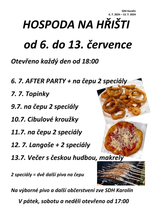 SDH Karolín si dovoluje pozvat všechny občany a příznivce, na otevřenou hospodu na hřišti. A to od 6.7.2024 do 13.7.2024. Každý den je pro Vás připraveno bohaté občerstvení, můžete se také mimo jiné těšit na různé pivní speciály a dobroty, jako jsou například topinky, cibulové kroužky, langoše a nebo i makrely. Srdečně Vás zvou pořadatelé.
