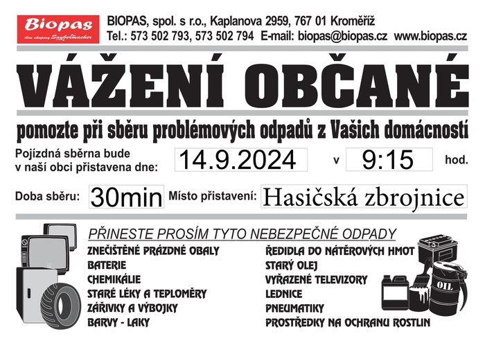 V sobotu, dne 14.9.2024 proběhne v naší obci svoz nebezpečného odpadu, a to u hasičské zbrojnice na Karolíně, od 9:15 do 9:45. Co vše můžete odevzdat, najdete na informačním plakátku na vývěsní desce obce Karolín na zastávce u školky. Prosíme občany, aby při shromažďování nebezpečného odpadu dodržovali pořádek. Pozor, vzhledem k silnému dešti, dbejte na správně uzavřené nádoby, a ukládejte nebezpečný odpad, v nádobách, které jsou čisté, a nebezpečný odpad, který nehrozí znečištěním okolí, díky vydatnému dešti. Děkujeme za pochopení.