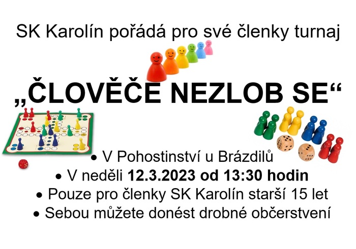 SK Karolín pořádá pro své členky turnaj v „ČLOVĚČE NEZLOB SE“. A to v neděli 12.3.2023 od 13:30 hodin v Pohostinství u Brázdilů. Turnaj je pouze pro členky SK Karolín starší 15 let. Sebou můžete donést drobné občerstvení. Na Vaši účast se těší pořadatelé.